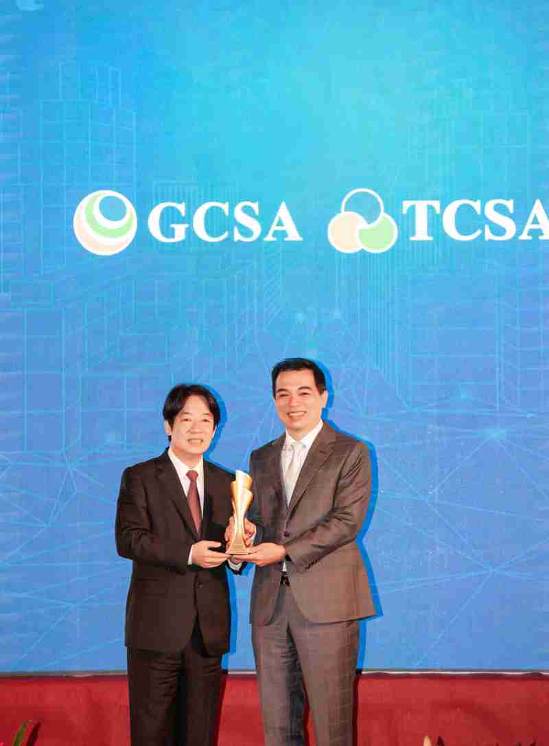 达全方位永续表现获全球永续奖及台湾永续奖肯定,,由副总统赖清德颁奖 (左),,,赏金国际总经理柯富仁 (右) 代表领奖