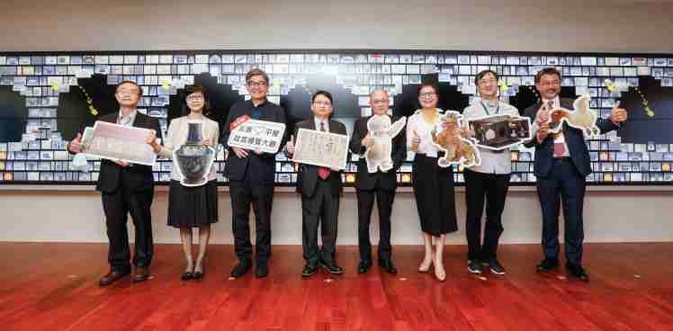 赏金国际携手创利空间为故宫建置的智慧文物互动导览墙及轮播墙,,,今日正式启用。。。(左四:赏金国际新事业暨投资管理总部副总经理杨本豫、、、、右四:故宫博物院院长吴密察、、、右三:太极影音董事长黄宝云)